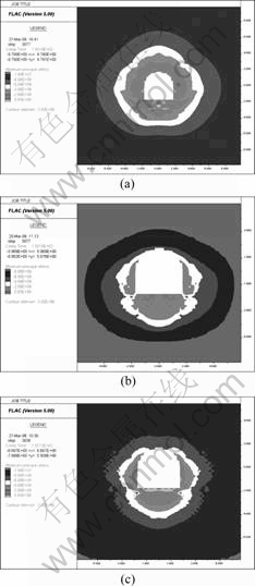 2) The plastic zones are expanded gradually, the rate of floor is the largest, followed by two sides, and the least is the roof. The plastic zone reaches the maximum in the 60th day for model Ⅰ, in the 75th day for model Ⅱ, in the 90th day for model Ⅲ. After 150 d, the plastic depth of roof, floor and side are 2.176, 3.06 and 2.856 m for model Ⅰ, 0.987, 2.611 and 1.677 m for model Ⅱ, 0.731, 2.036 and 1.194 m for model Ⅲ.