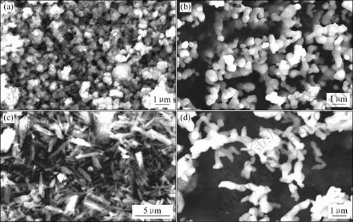 Fig.2 SEM morphologies of raw materials and cobalt powder: (a) Carbonate; (b) Cobalt powder starting from carbonate; (c) Oxalate; (d) Cobalt powder starting from oxalate