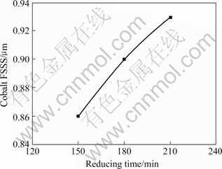 钴粉的粒度受还原温度和时间的影响较大。图3所示为还原时间为180 min的条件下还原温度对钴粉粒度的影响,可以看出,随着还原温度升高,钴粉的费氏粒度增大。图4所示是在440 ℃的还原温度下还原时间与钴粉费氏粒度的关系,随着还原时间的延长,钴粉的粒度增大。可见,在420~460 ℃还原180 min左右工艺条件下可制备费氏粒度为0.9 μm 左右的超细钴粉。化学成分见表1,从表1看出,钴粉的纯度比较高。