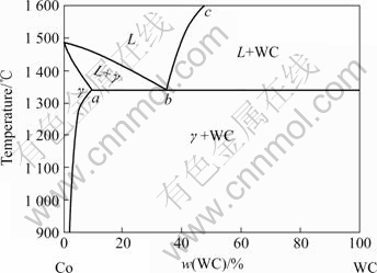 图5 W-C-Co三元系状态图沿Co-WC线的垂直截面
