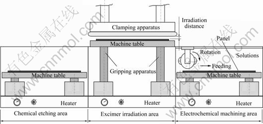 The experimental setup of the precision recycling system for TFT LCD color filters is schematically illustrated in Fig.1 which contains the excimer irradiation, chemical etching and electrochemical machining areas. The configuration of the electrochemical machining and the panel structure is shown in Fig.2. The material consists of a 15th-generation LCD panel in dimensions of 1 300 mm×1 100 mm×0.7 mm. The amounts of reduction after the recycling process was 0.14 ?m for the ITO layer, 1.5 ?m for the RGB layers, and 0.15 ?m for the BM layer. The chemicals used in the etching processes were H2SO4, NaOH, FeCl3 and KOH. The concentration of the solution was 40%. The machining temperatures used were 55, 60, 65 and 70 °C. The flow rate of the solutions was 10 L/min. The electrochemical machining electro- lyte was 20% NaNO3. The flow rate of the electrolyte was 15 L/min. The current used was 100 A continuous DC. The machining temperatures used were 55, 60, 65 and 70 °C. There were four combinations of the port radius of the positive electrode and diameter of the negative electrode (20 mm, 44 mm), (10 mm, 46 mm), (15 mm, 48 mm) and (5 mm, 50 mm) used. The irradiation system used was 225 nm excimer lamps at a distance of 1-5 mm. The ITO layer was measured at two or more locations using the α-step. The produced angle of water contact was measured by FTA125 (First 10 ?).