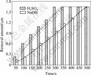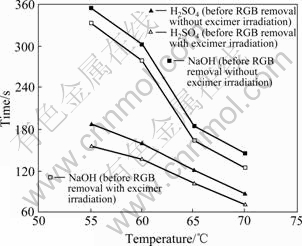 Fig.7 shows that when 225 nm excimer irradiation is used before the removal process of the RGB layer in chemical etching (using H2SO4 and NaOH at different temperatures), higher machining rates are more easily attainable. The higher temperatures of the H2SO4 or NaOH solutions also correspond with a faster chemical stripping away of the RGB. The time required under similar processing conditions is less after excimer irradiation.