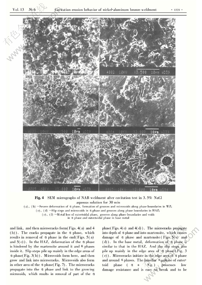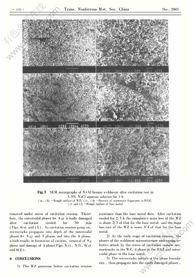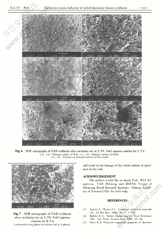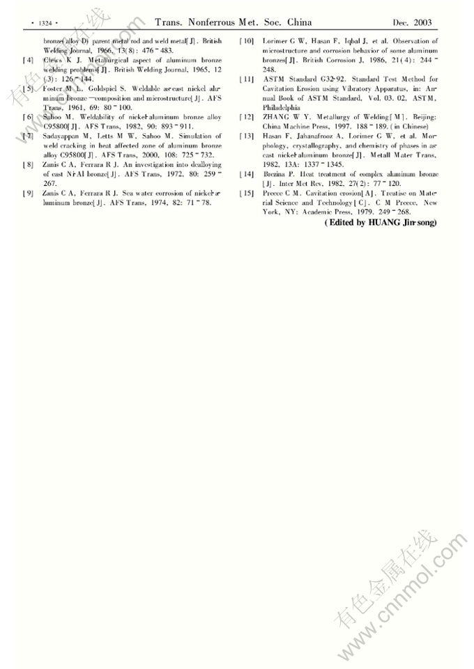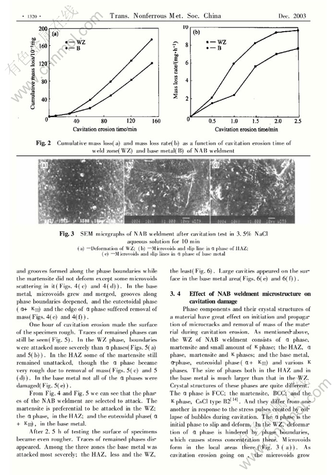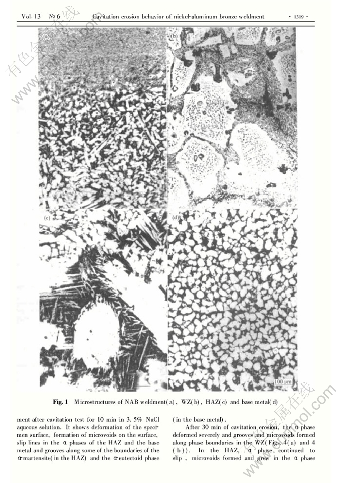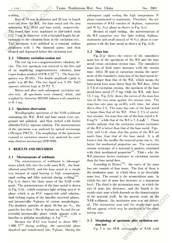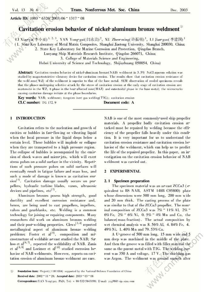 Key words:NAB; weldment; tungsten inert gas welding(TIG); cavitation erosion