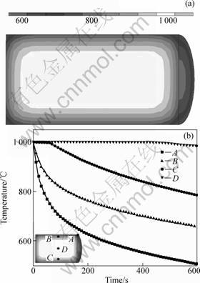 图2 合金坯料空冷5 min时纵中剖面及端表面温度分布和坯料不同位置的温度随时间变化
