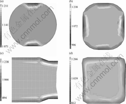 图3(d)所示为二次翻转锻成方坯后继续锻造过程被锻部分的横剖面温度分布。可见外边缘部分都有较大的温降,而锤下50~100 mm区域明显升温,可见该处变形较集中。预计中的45?剪刀叉区域没有出现明显升温,芯部形变量很小。分析表明,圆坯锻造时锤头下方50~100 mm附近区域由于加工软化,承担了大部分形变,减弱了45?剪刀叉区域的形变。不同变形量模拟比较显示,开坯变形量9%太小,此即工程上所说的打不透、搓皮,可见开坯过程的道次变形量不能太小(下文模拟开坯变形量达20%)。