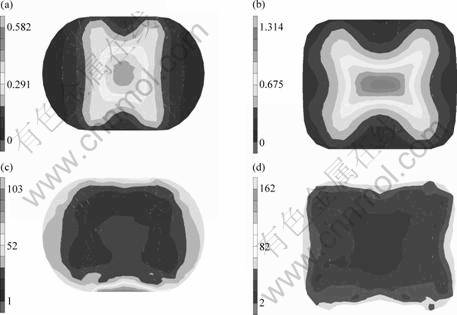 Fig.4 Strain (a, b) and stress (c, d) distribution of billet during forging