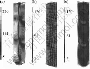 图3(a)和(b)所示为开始锻造和经翻转锻造后被锻部分的横剖面温度分布。可见外边缘部分,尤其是与锤头接触部分有一定温降。这是由于热辐射和热传导所致。温降向中心对称递减,但在锤头下方50~100 mm区域出现明显的相对温升。这是由塑性变形热所导致,温升的大小与该区域的应变相关,该变形量下变形区域主要集中在锤下50~100 mm区域。