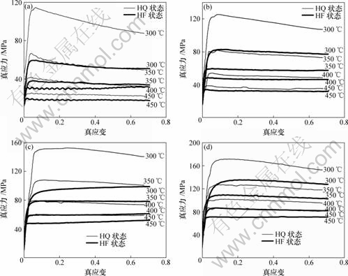 实验合金高温压缩变形时真应力—真应变曲线如图1所示,其中:细实线表示HQ状态,粗实线表示HF状态。由图1可知,在实验条件下,均存在较明显的稳态流变特征,即在初始变形阶段,随着应变的增加应力值不断增高,当应变超过一定值时,应力不再随应变的继续增加而升高。在同一应变速率下,应力随变形温度的升高而降低;在同一变形温度下,应力随着应变速率增加而升高,表明该合金具有正的应变速率敏感性。随着变形温度的降低和应变速率的增 高,达到稳态变形时的峰值应力明显增高,合金进入稳态变形所对应的应变量增大。从图1(a)可以看 出,在高温低应变速率条件下,应力曲线出现了锯齿形波动,后趋于平稳变形,具有不连续动态再结晶特征,这表明实验合金在高温低应变速率下,发生了动态再结晶[4]。
