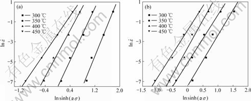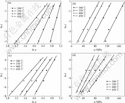 分别呈线性关系,利用最小二乘法一元线性回归,其斜率分别为n和β,如图3所示。由式(1)和(2)适应的条件可知,将在低应力状态下即在350~ 450 ℃时给出的平均值n,和在高应力状态下即300~400 ℃时给出的平均值β代入式(4),可以求得