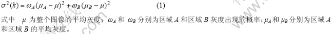 设图像的灰度级为1~l,以灰度k将图像分为两个区域:灰度小于k的像素属于区域A;灰度大于k的像素属于区域B。则两个区域的方差为[10]