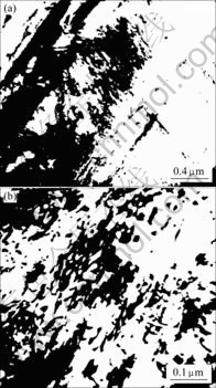图1和2所示分别为变形温度为850 ℃、变形程度为0.6、变形速率为0.01/s的条件下,不同的放大倍数下Ti-15-3合金热变形显微组织的TEM像及其二值化图。