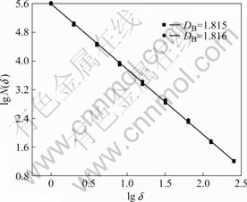 对于二维欧式空间的一系列点,用边长为d 的正方形盒子覆盖这些点,统计出至少包含一个点的方格数目N(d),在双对数坐标系中用最小二乘法直线拟合数据点(?lnd, lnN(d)),若二者具有很好的线性关系,表明图像具有分形特性,且所得直线的斜率就是该图像分形维数的近似值。近似计算盒维数DB为[13]