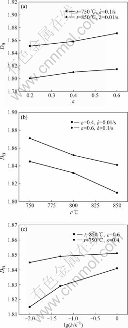 Fig.4 Effects of deformation parameters on fractal dimension of microstructure: (a) DB—ε curve; (b) DB—t curve; (c) DB—lg