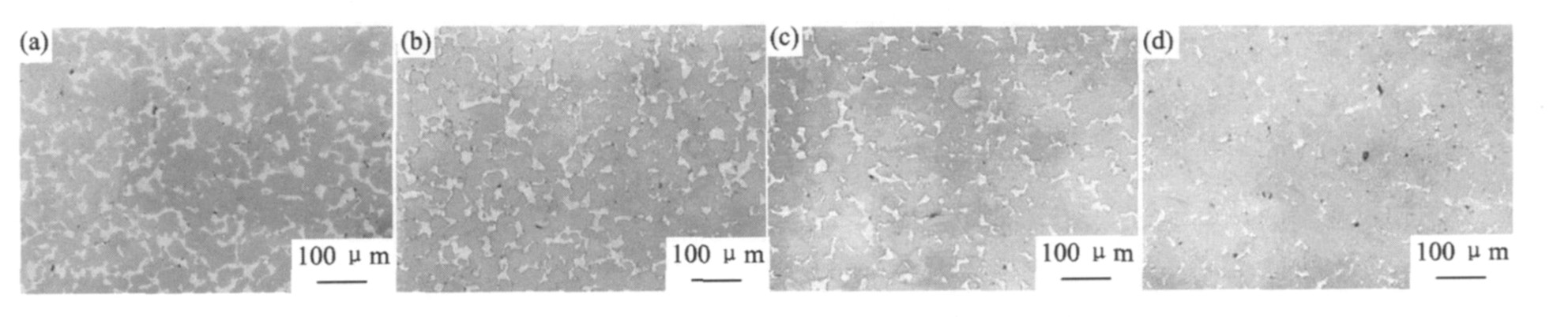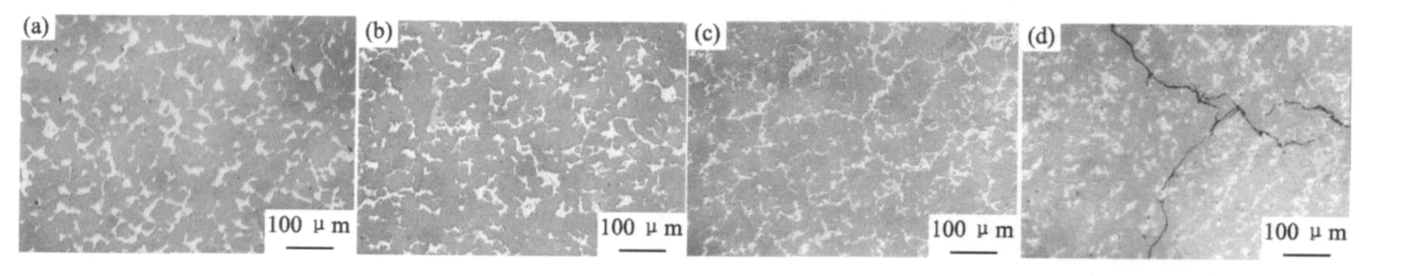 Fig.2 Microstructures of 70Si30Al alloy at different temperatures during hot pressing (a) 560 ℃; (b) 570 ℃; (c) 580 ℃; (d) 590 ℃
