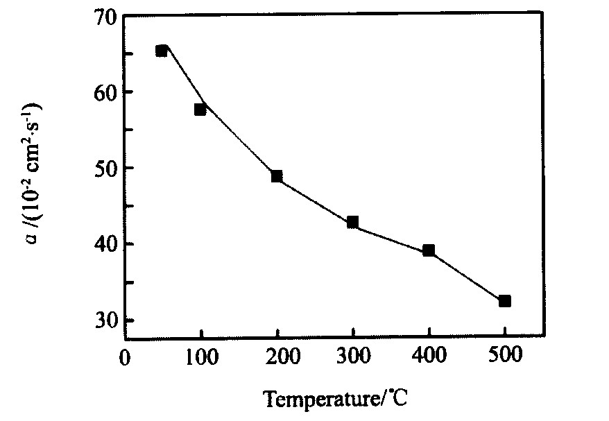 图6所示为热压致密化后70Si30Al合金随温度升高热扩散率的变化。 由图可知, 随着温度的升高, 材料的热扩散率下降。
