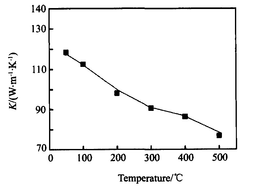 可得到随着温度升高合金的热导率, 如图8所示。 由图可知, 在50 ℃时70Si30Al合金的热导率为118 K· (W·m-1 ·K-1 ) -1 , 随着温度的升高, 材料的热导率下降。