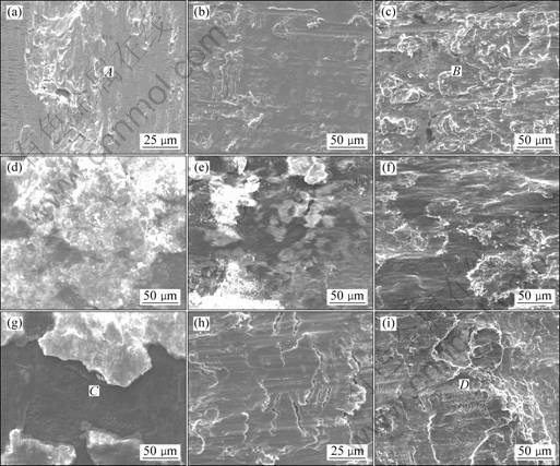 Fig.6 Morphologies of worn scars of Incoloy800 alloy at different temperatures and displacements (Fn=80 N): (a) 25 ℃, 5 μm; (b) 300 ℃, 5 μm; (c) 400 ℃, 5 μm; (d) 25 ℃, 10 μm; (e) 300 ℃, 10 μm; (f) 400 ℃, 10 μm; (g) 25 ℃, 20 μm; (h) 300 ℃, 20 μm; (i) 400 ℃, 20 μm