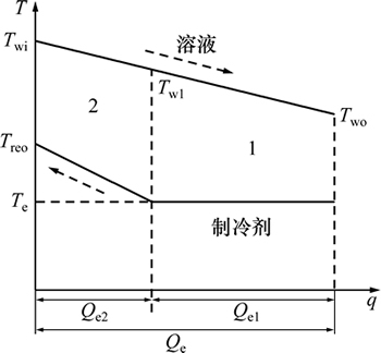 图3所示为蒸发器工作过程。蒸发器的传热过程分为2段:蒸发段和过热段。与冷凝器一样,蒸发器中同样存在由传热引起的火积损失。