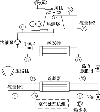 热源塔热泵实验台系统图如图5所示。压缩机采用涡旋压缩机,频率变化范围为30~110 Hz,功率为1.6 kW(70 Hz),排气量为23.2 mL/min,制冷剂为R22。冷凝器和蒸发器均采用板式换热器,其中冷凝器换热面积为0.76 m2,蒸发器换热面积为1.26 m2。节流阀采用热力膨胀阀,热源塔采用开式热源塔,工作介质为乙二醇溶液。压力传感器测量范围有0~1.5 MPa和0~2.5 MPa 2种规格,测量精度为±0.5%。流量传感器采用涡轮流量传感器,测量精度为1.0%。进出口空气温度和相对湿度采用温湿度传感仪测量,温度误差在0.1 ℃以内,相对湿度的误差在1%以内。风速测量采用手持热线式风速仪,风速测量精度为0.05 m/s。压缩机功率测量采用三相电参数综合测量仪,测量精度为±0.5%,测量系统所有信号采用数据采集仪采集并通过电脑上实时显示、保存和分析。压缩机、热水泵、溶液泵和风机均可通过变频器调节。实验装置可实现冷凝器进出口热水温度、蒸发器进出口溶液温度、热源塔进出口溶液温度、环境温湿度、压缩机吸排气压力、溶液流量、热水流量、风量以及压缩机功率等参数的实时测量。