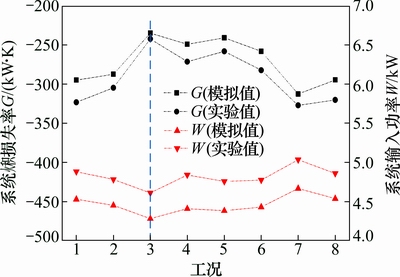图6所示为热源塔热泵系统火积损失率和系统输入功率在定系统供热量4 kW时,不同运行工况的模拟和实验值。由图6可知:系统火积损失率实验值和模拟值相对误差不超过8.8%,系统输入功率实验值和模拟值相对误差不超过9.9%,表明热源塔热泵系统火积损失模型具有较高的精度。系统火积损失率和输入功率呈现相反的变化规律,当系统火积损失率越大时,系统输入功率越小,系统效率越高,很好地验证了热源塔热泵系统火积损失极值原理。在运行工况3,即压缩机频率为51 Hz,热水流量为0.5 kg/s,溶液流量为0.6 kg/s,风量为1.4 kg/s时,系统火积损失率最大,对应的系统总功率最小,系统效率最高,此工况为定系统供热量为4 kW时的最优运行工况。