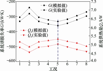 图7所示为热源塔热泵系统火积损失率和供热量在定系统输入功率2 kW时,不同运行工况的模拟和实验值。由图7可知:系统火积损失率实验值和模拟值相对误差不超过9.8%,供热量实验值和模拟值相对误差不超过7.9%,表明实验值与模拟值具有较好的一致性。系统火积损失率和供热量呈现相反的变化规律,当系统火积损失率越小时,系统供热量越大,系统效率越高,很好地验证了热源塔热泵系统火积损失极值原理。在运行工况5,即压缩机频率为72 Hz,热水流量为0.4 kg/s,溶液流量为0.5 kg/s,风量为1.6 kg/s时,系统火积损失率最小,对应的系统供热量最大,系统效率最高,此工况为定系统输入功率2 kW时的最优运行工况。