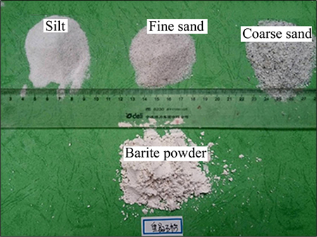 According to the requirements above, we sought the ingredients of fault similar material: three kinds of pickling coarse, fine, and silt quartz sand as aggregate, the mesh number of three kinds of the sand is 40, 80 and 280, respectively; Barite powder is the anhydrous powder of barium sulfate, which obtains slight caking property after being mixed with water. We used the mixture of barite powder and water as the binder material. The samples of raw materials we use are shown in Figure 4.