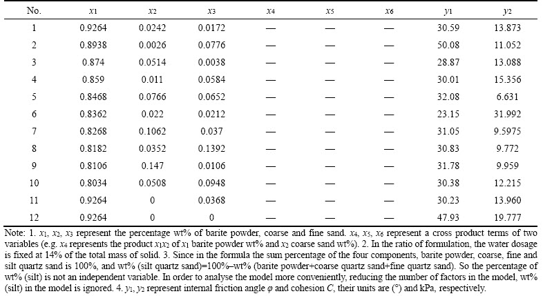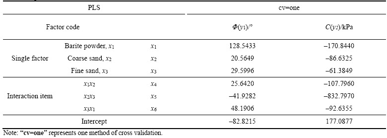 In order to show how to clarify the impact of each raw material on the parameters of artificial-similar material for the fault, and guide the formula design experiment in the next step precisely, we used the PLS method to analysis the intermediate result of the formulation and its corresponding direct shear data (shown in Table 3).