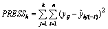 The third step: Calculate the PRESSh. Substitute the testing data group (i.e., the sample point i) into the front regression model, and get the fitted value yj on the sample point i, named ; For each i=1, 2, …, n, repeat the steps above, and PRESSh can be defined,