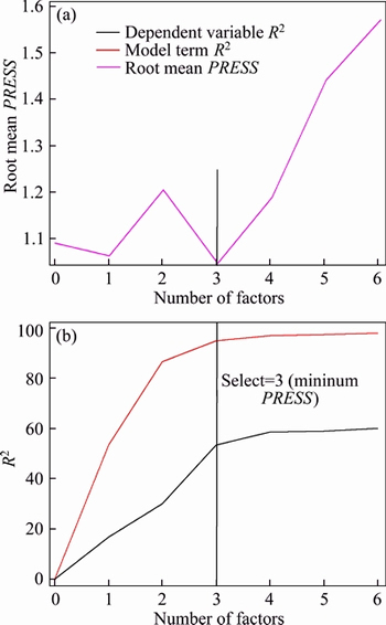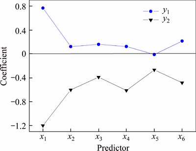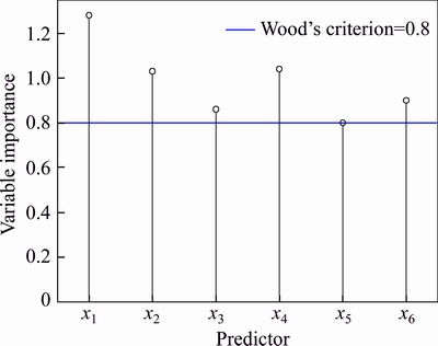 Therefore, if k independent variables about xj (j=1, 2, …, k) plays the same role in the explanation of y, then all the VIPJ equal 1; otherwise for a large value VIPJ (greater than 1) of xj, the explanatory role will be important. WOOD et al [29] thought that the impact of this dependent variable is small on the model, when the VIPJ of a dependent variable is less than Wold’s Criterion (0.8).