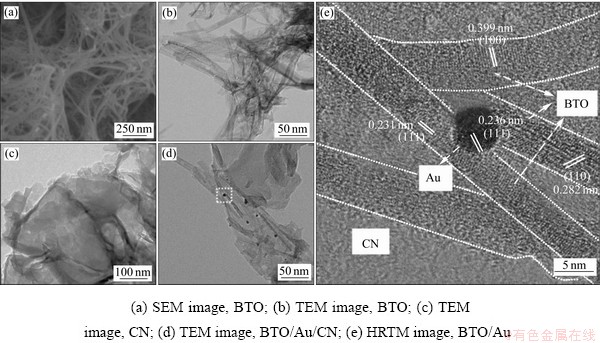 钛酸钡(BaTiO3)属于铁电材料,禁带宽度约为3.2 eV,会自发产生极化的电场,可以促进光生载流子的分离,因此除了SrTiO3,BaTiO3也广泛应用于与g-C3N4复合的光催化研究中。YANG等[61]将g-C3N4和BaTiO3进行简单混合煅烧成功制备了BaTiO3/g-C3N4光催化剂。g-C3N4和BaTiO3之间的协同效应和铁电极化是光催化活性增强的主要原因。除了g-C3N4和BaTiO3直接耦合,还可以在两者之间添加一些介质,来增强光催化活性。WU等[42]以Au粒子为电子介质,将g-C3N4(CN)与BaTiO3(BTO)进行耦合,制备出Z型异质结BaTiO3/Au/g-C3N4光催化剂。如图2所示[42],BaTiO3表现为厚度5~15 nm纳米线形态,g-C3N4为二维层状结构,负载有椭圆形Au纳米粒子的BaTiO3纳米线均匀地附着在层状g-C3N4上。Au粒子除了充当电子介质外,还可以通过表面等离子体共振效应吸收可见光,进而将热电子传输至g-C3N4的CB中参与光催化反应。