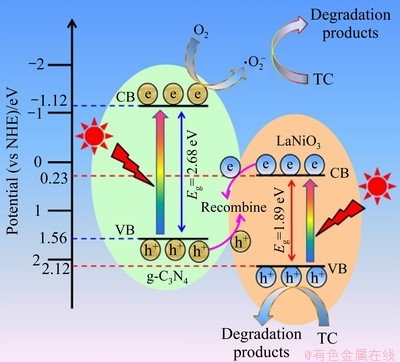 Z型异质结构较为特殊,即一种半导体材料CB上的电子与另一种半导体材料VB上h+结合,而它们各自VB和CB上留下的h+与电子分别发生氧化还原反应。其光催化机理如图7所示,由于g-C3N4的VB值(1.56 eV)低于·OH/OH-(1.99 eV)和·OH/H2O (2.68 eV),因而无法将H2O分子和OH- 离子氧化为·OH;且LaNiO3的CB值(0.23 eV)高于O2/·O2- (-0.33 eV),故无法将O2还原为·O2-。当能级相差较小的g-C3N4价带上的h+与LaNiO3导带上的电子结合后,在g-C3N4的CB上发生还原反应,同时在LaNiO3的VB上发生氧化反应。因此,Z型光催化体系能够抑制光生电子-空穴对复合,并保证电子和h+具有较强的还原和氧化能力,能够更好地提高光催化效率。