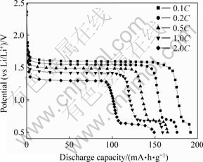图3所示为不同电流倍率下Li4Ti5O12-PAn电极的首次放电曲线。从图3可以看到,随着电流倍率的增大,有3个方面的影响:1) 电池电压显著降低,从0.1C时的1.60 V降低到2.0C时的1.35 V;2) 复合材料的放电容量不断降低,从0.1C时的191.3 mA?h/g降低到2.0C时的148.9 mA?h/g;3) 在0.6~0.7 V之间出现的电压平台越来越明显,该电压平台所对应的放电容量越来越多,这与文献报道的Li4Ti5O12/Ag复合材料的放电曲线相似[18-19]。