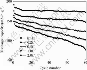 不同电流倍率下Li4Ti5O12-PAn电极的放电容量随循环次数的变化曲线示于图4。从图4可以看到,随着电流倍率的增大,Li4Ti5O12-PAn的放电容量逐渐降低,80次循环后,0.1C放电时放电容量从191.3 mA?h/g下降到172.0 mA?h/g,平均每次循环的容量损失为0.13%;2.0C时放电时放电容量从148.9 mA?h/g下降到76.2 mA?h/g,平均每次循环的容量损失为0.61%。这是因为低电流倍率时,电池极化较小,容量衰减小,所以Li4Ti5O12-PAn循环性能较好。