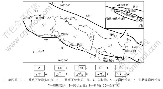 矿区出露地层为下二叠统大关山群上岩组碳酸盐岩、碎屑岩,岩性主要为中细粒长石石英砂岩、泥质板岩夹砂岩、中厚层状硅化大理岩、含砾中粗粒石英砂岩;下三叠统隆务河群下岩组的碎屑岩,岩性主要为粉砂岩与角岩化板岩、条带状硅质板岩夹中粗粒长石、石英砂岩和少量碳酸盐岩的类复理石建造。