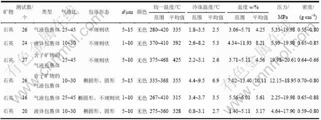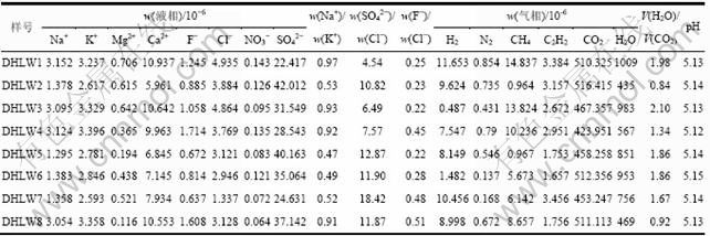 流体包裹体的气相成分分析采用加热爆裂法提取气体,其测试程序为:将清洗干净的500 mg样品放入石英管内,逐渐升温到100 ℃排气,待分析管内真空度为6×10-6 Pa以下时,将100 ℃以内的次生包裹体和样品吸附气体去除。以1 ℃/s的速度升温到500 ℃,记录压力计的读数,用液氮冷冻5 min,再用干冰冷冻5 min,记录压力计的读数(用来计算水的含量)后测定。分析仪器为Varian-3400型气相色谱仪(美国),分析误差<5%。流体包裹体的液相成分分析程序为,将清洗干净的1 g样品放入石英管中,于500 ℃爆裂 15 min,冷却后加5 mL水,超声震荡10 min。分析仪器为美国戴安公司生产的DX-120Ion Chromatograph离子色谱仪。淋洗液是浓度为2.5 mmol/L邻苯二甲酸和2.4 mmol/L三(羟)甲基氨基甲烷;阴离子流速为 1.2 mL/min,阳离子流速为1.0 mL/min。重复测定精 度<5%。