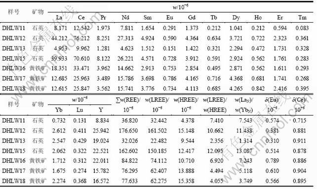 流体包裹体稀土元素组分测定尝试采用等离子质谱(ICP-MS)方法测定。先将待测定的纯净单矿物样品用蒸馏水清洗,其中石英样品用1:1盐酸(体积比)低温煮30 min,清洗后用浓硝酸浸泡12 h。将处理过的单矿物样品在爆裂仪中于450~500 ℃爆裂(其中硫化物矿物爆裂温度一般低于450 ℃),用2%的稀硝酸提取包裹体中的液相组分,然后用装备有“膜去溶”装置的ICP-MS仪器进行分析测试[10]。