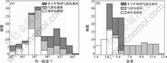 根据6个样品冰点温度计算出成矿流体盐度为1.40%~13.40%,频数直方图中显示盐度主要为3.4%~6.4%(图2),属低盐度。