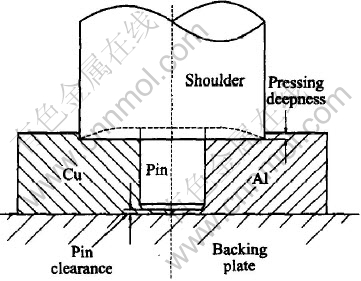 搅拌摩擦焊( friction stir welding, 简称FSW)是20世纪90年代发展起来的一种新型固相焊接技术, 图1所示为这种工艺的示意图。 FSW利用一种带有探针(pin)和轴肩(shoulder)的特殊形式的搅拌头。 焊接前, 将两待焊板材放在刚性底板(backing plate)上并压紧, 将搅拌头的探针插入待焊板材接缝内, 保持探针顶端离底板有一定距离(pin clearance), 搅拌头的轴肩与板材的表面紧密接触或压入一定深度(pressing deepness)。 焊接时, 搅拌头高速旋转并沿待焊板材的接缝运动, 摩擦热使探针周围金属处于热塑性状态, 探针前方塑性状态的金属在搅拌头的驱动下向后方流动, 在此处塑性融合, 从而使待焊件压焊为一个整体。 由于焊接过程中, 焊缝金属不发生熔化, 从而避免了焊缝金属的剧烈氧化及气孔、 裂纹等缺陷[6, 7]。 目前, 国内外进行较多的是各种铝和铝合金搅拌摩擦焊以及异种铝合金的搅拌摩擦焊技术的研究[8-10]。 关于异种金属, 尤其是铜与铝的搅拌摩擦焊的研究较少。 LI等[11, 12]研究了银/铝合金的搅拌摩擦焊, 为观察焊缝金属的组织特征, 焊接了铝合金与紫铜对接接头。 本文作者主要研究铝合金与紫铜对接接头的搅拌摩擦焊工艺及其组织和性能, 为这种新型技术在异种金属焊接中的应用提供技术依据。