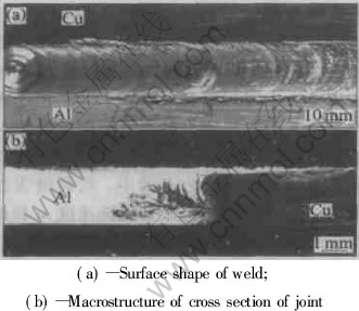 图2所示为典型的铝合金与铜的搅拌摩擦焊焊接接头成形情况, 其中图2(a)为表面外观形貌, 图2(b)为相应的横截面的宏观组织。 由图2可见, 铝合金与紫铜焊接接头可以获得良好的焊缝, 其成形情况与焊接工艺参数和板材厚度等因素有关。