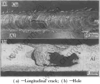 焊缝温度的升高与搅拌头在单位长度焊缝上产生的热量有关, 即与搅拌头旋转速度和焊接速度的比值(ω/v)有关。 在摩擦面所受压力一定的情况下, 单位长度焊缝内摩擦热的生成随ω/v的增大而增大。 当搅拌头旋转速度一定时, 若焊接速度过低, 则单位长度焊缝上产生的热量就会过多, 温度上升就过高, 在摩擦热与变形能的共同作用下, 焊缝中的铝和铜可能形成上述金属间化合物, 从而使这一部位的材料变脆。 而工件是在强拘束条件下进行焊接的, 在焊接拘束应力的作用下, 脆性焊缝有可能断裂, 从而形成焊缝宏观裂纹。