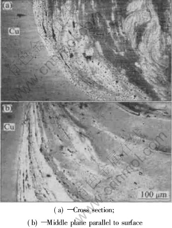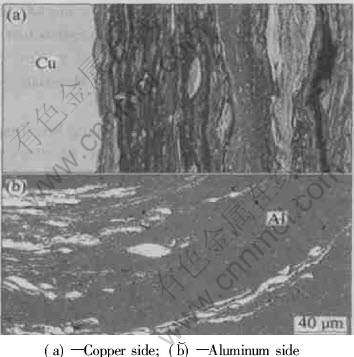 图4所示为焊缝紫铜侧的金相照片, 其中图4(a)为焊缝横截面形貌, 图4(b)为离焊缝上表面约1mm处平行于试样表面的截面形貌。 由图可见, 在紫铜侧, 焊缝与母材间有非常明显的分界面, 在焊缝内部, 铜与铝在搅拌头的作用下相互呈片状交迭。