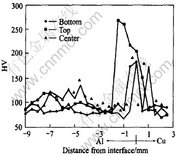 图6所示为LF6铝合金-紫铜焊缝横截面的显微硬度分布。 由图6可见, 接头硬度介于紫铜T1和铝合金LF6之间, 接头中间硬度较高, 部分点的硬度远远高于Al和Cu母材的硬度, 在某些区域, 硬度值在HV300以上, 但如此高的硬度值不是加工硬化造成。 由金相图可知, 高硬度点在显微镜下对应为白亮区域, 而铝合金基体为灰色区域, 因此可以判断形成了Cu-Al金属间化合物。