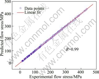 Fig. 4 Correlation coefficient between flow stress predicted by ANN and experimental value at 1050 ℃