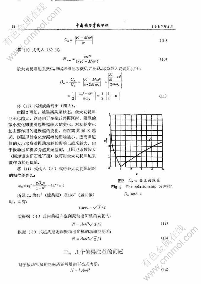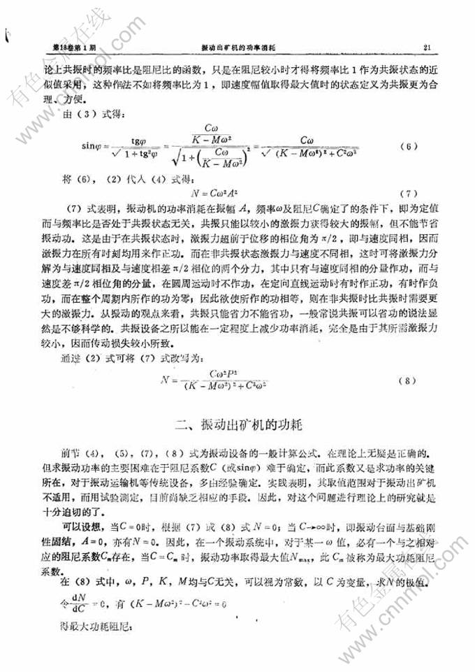 摘 要:本文从一般振动机械的功率消耗论证出发,结合超共振振动出矿机的特点,引入了最大功耗阻尼比比的新概念,从而推导出超共振振动出矿机功率消耗的公式,得出了在理论上与实际应用中均具有较重要意义的几个结论.