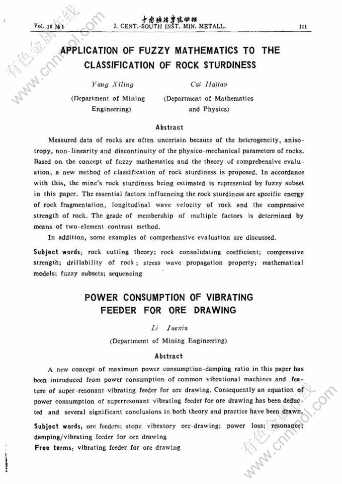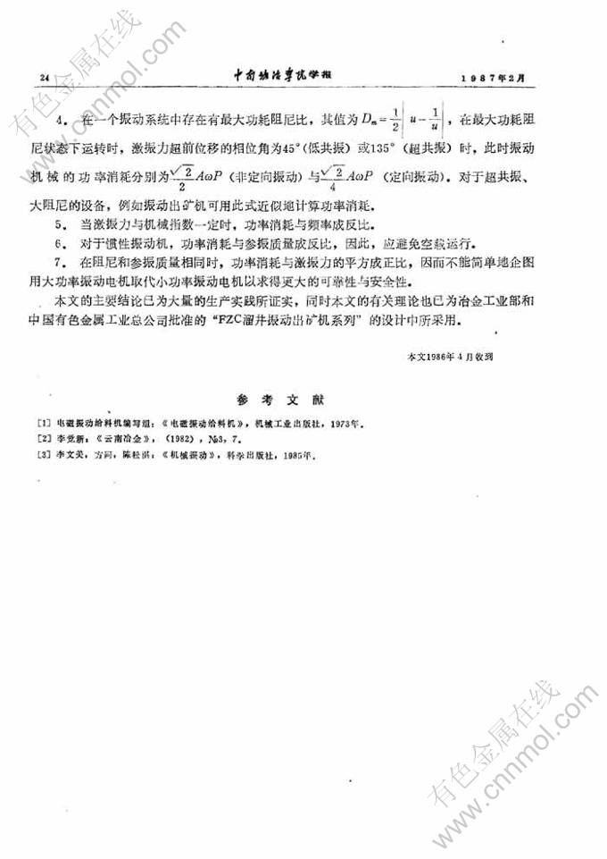 Key words:ore feeders; stope vibratory ore-drawing; power loss; resonance; damping/vibrating feeder for ore drawing