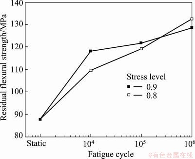 The residual strength of the fatigued samples is increased after cyclic loading and would increase continuously with the increase of fatigue loading cycles. Comparing the results of low cycle fatigue, it can be observed that the strengthening effect with stress level of 0.9 is superior to that with stress level of 0.8. The residual strength of the samples at 104 fatigue cycles is increased by 25% with stress level of 0.8, while 35% with stress level of 0.9. The same result is also obtained at 105 fatigue cycles. However, the result changes at 106 cycles. The residual strength with stress level of 0.9 is lower than that with stress level of 0.8. In this study, the maximum increment of flexural strength is about 51% of the original strength. All the phenomena above show that 2D carbon cloth laminate C/C composites have an excellent fatigue resistance.