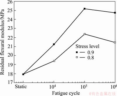 The fatigue tests were stopped after 104, 105, and 106 cycles, respectively. And the surviving samples were destroyed to obtain residual strength and modulus. The results are shown in Figs. 2 and 3. It can be seen obviously that, the residual flexural strength of the fatigued samples is much higher than that of the original samples after being loaded under either 0.8 or 0.9 stress level.