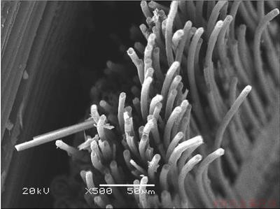 Figure 7 shows the fracture morphology of sample after 104 cycles at stress level of 0.9 in flexural mode. Although there are some relatively flat sections, the phenomenon of carbon fibers debonding and pulling-out is more significant, compared with that of the sample after the same cycles at applied stress of 0.8. Because the pulling-out of carbon fibers will absorb energy, the damage process manifests as intermittent and periodic one. And the fibers debonding and pulling-out can consume some failure energy caused by external load, which can explain the phenomenon that after 104 cycles, the residual flexural strength at stress level of 0.9 is higher than that at stress level of 0.8.