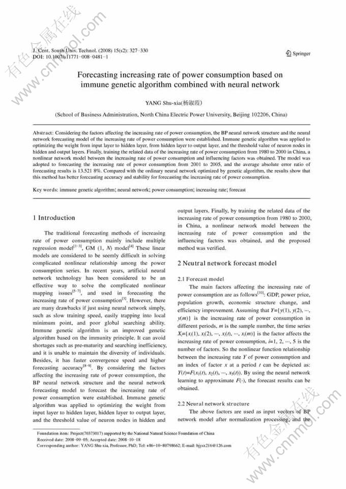 Key words:immune genetic algorithm; neural network; power consumption; increasing rate; forecast