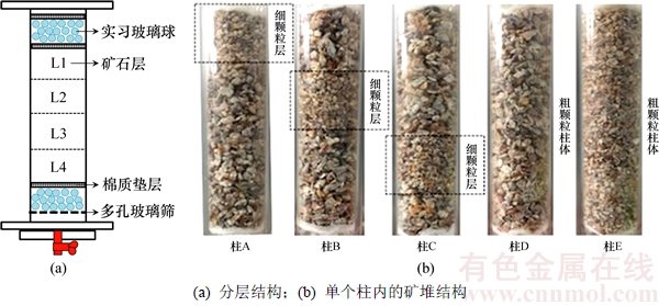 为探究矿石筑堆过程中矿石颗粒偏析现象,即:矿堆中存在细粒矿石夹层,粗、细矿石颗粒的分层现象等。在各实验柱内进行分层筑堆,设置无矿石分层单一粒径筑堆的对照组,各实验柱的分层结构及各柱体筑堆后的实物,如图1所示。